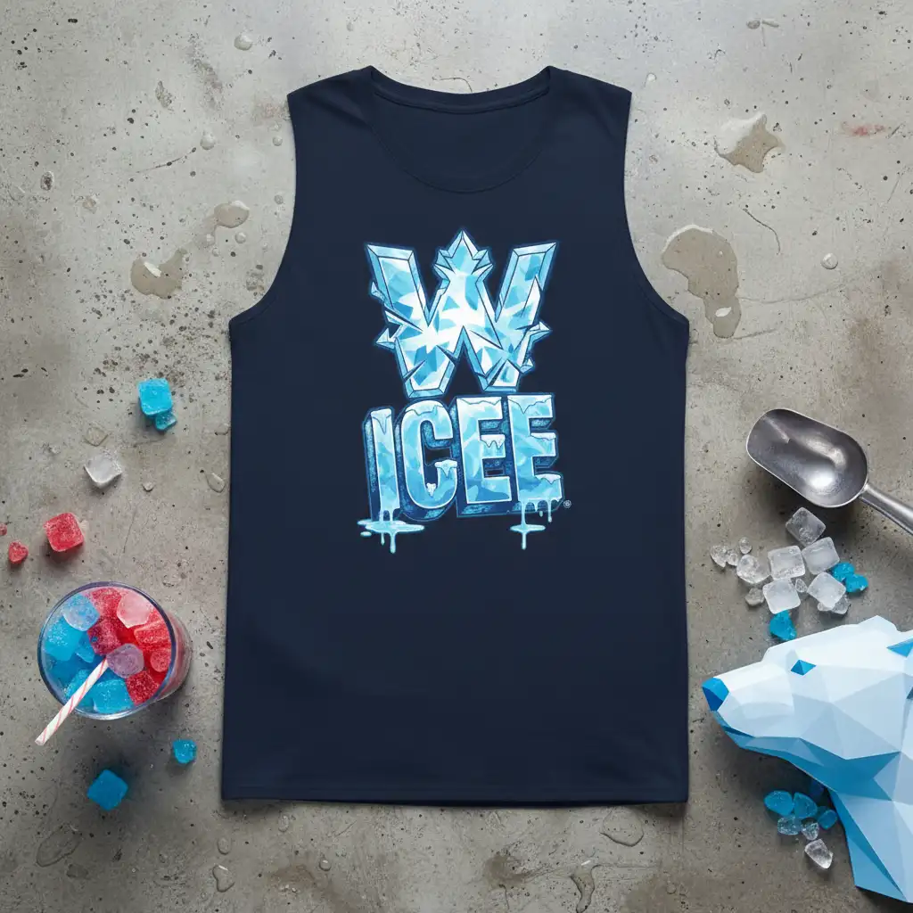 This tank top proudly features the unmistakable W ICEE logo, a symbol of icy delight and pure refreshment. The design is rendered with a vibrant, dripping ice effect that perfectly mimics the texture and coolness of a slushy. The bold “W” graphic above the text is crafted from crystalline ice shards, adding a dynamic and frosty visual appeal. It’s a design that instantly evokes feelings of summer days, fun, and the simple pleasure of a cold, sweet treat.