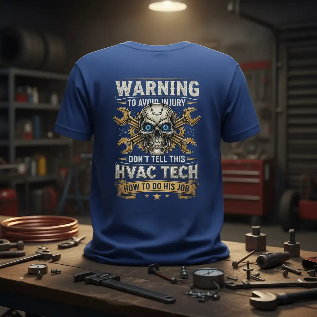 WARNING TO AVOID INJURY DON’T TELL THIS HVAC TECH HOW TO DO HIS JOB boldly states the sentiment on this unique t-shirt. This design speaks directly to the skilled professionals who keep our homes and businesses comfortable year-round. It’s crafted for those who understand the intricacies of heating, ventilation, and air conditioning systems and appreciate a touch of humor about their expertise. The graphic elements, including the striking mechanical skull and crossed wrenches, perfectly complement the message, making it a standout piece for any HVAC technician. It’s more than just apparel; it’s a badge of honor for a demanding and essential profession.