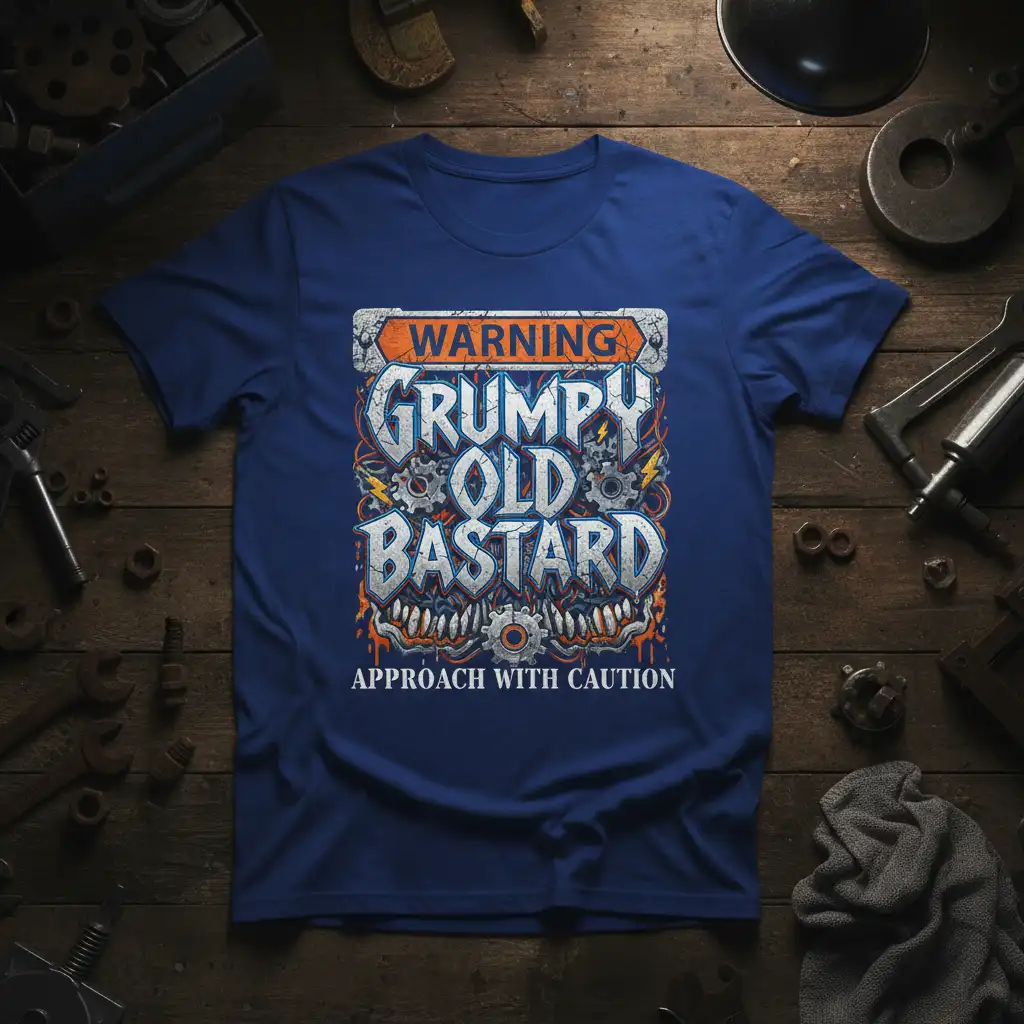 This unique t-shirt boldly proclaims “WARNING GRUMPY OLD BASTARD APPROACH WITH CAUTION,” making it an instant conversation starter. The distressed, industrial-style lettering combined with menacing graphics like gears and lightning bolts creates a powerful visual that resonates with a certain kind of independent spirit. It’s designed for those who have a wealth of experience and aren’t shy about letting the world know they have a distinct perspective.
