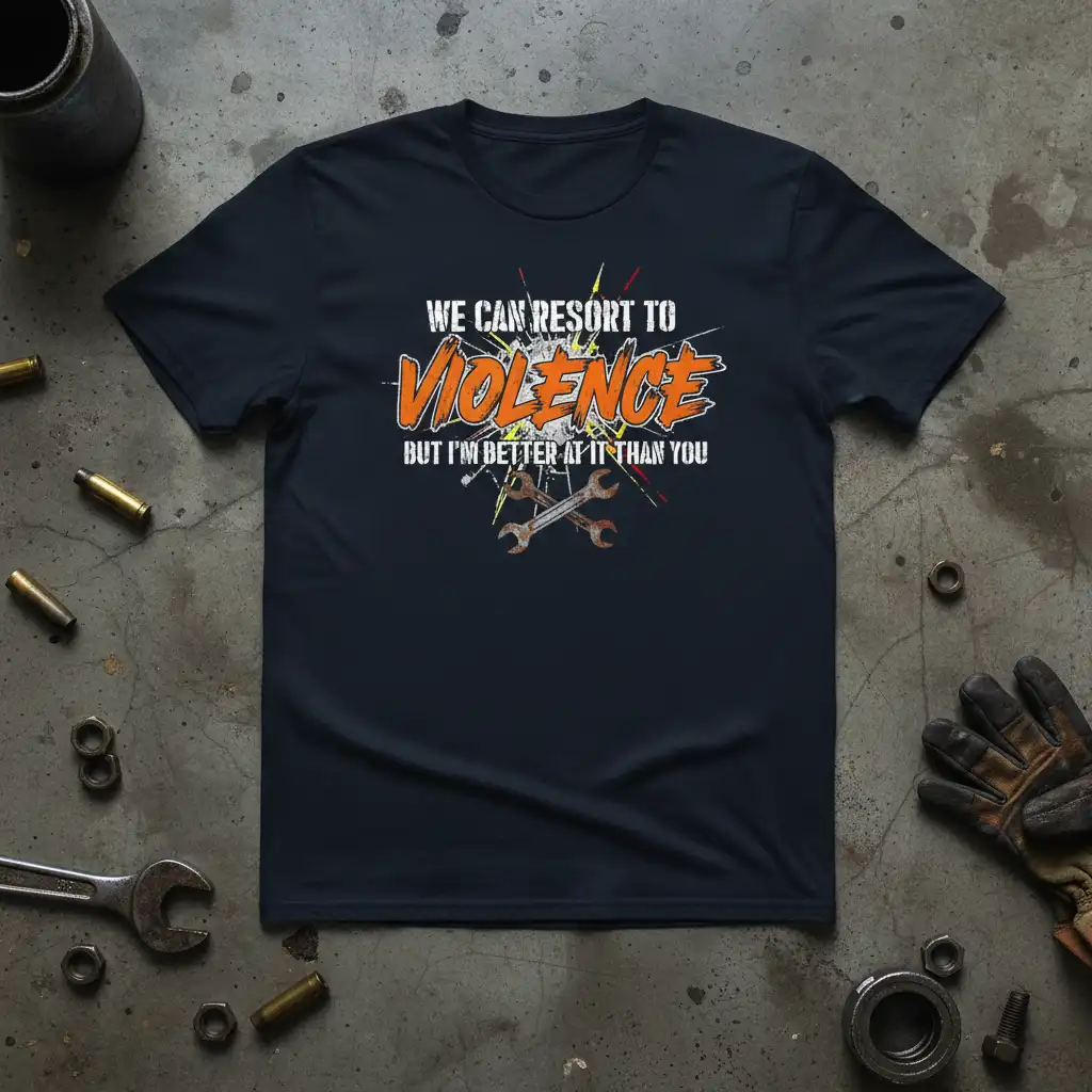 We Can Resort To Violence But I’m Better At It Than You T-Shirt is more than just apparel; it’s a declaration of playful dominance and sharp wit. This design speaks to those who understand that sometimes, a clever comeback is the best form of “violence.” It’s perfect for mechanics, engineers, or anyone who enjoys a good laugh and a bit of friendly banter. The bold graphic and provocative slogan are sure to turn heads and spark conversations, making it a standout piece in any casual wardrobe. Embrace your superior wit with this unique and memorable tee.