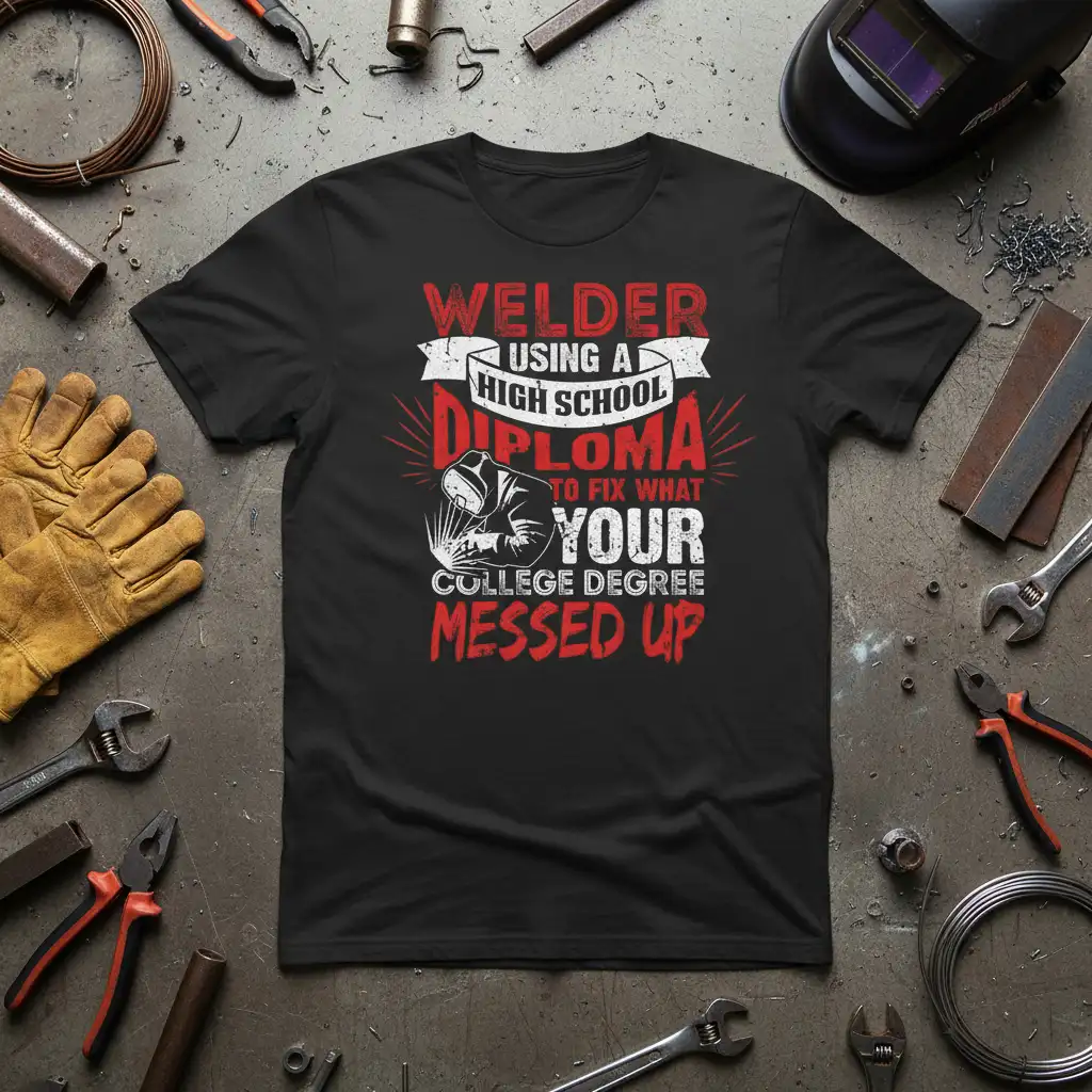 Don’t miss out on this opportunity to own a piece of apparel that truly represents the skilled trades. The “Welder Using A High School Diploma To Fix What Your College Degree Messed Up” t-shirt is a must-have for any proud welder, mechanic, or tradesperson. It makes an unforgettable gift that will be cherished for its humor and its message. Add this unique tee to your wardrobe and let your skills shine! Order yours now and embrace the power of practical expertise.