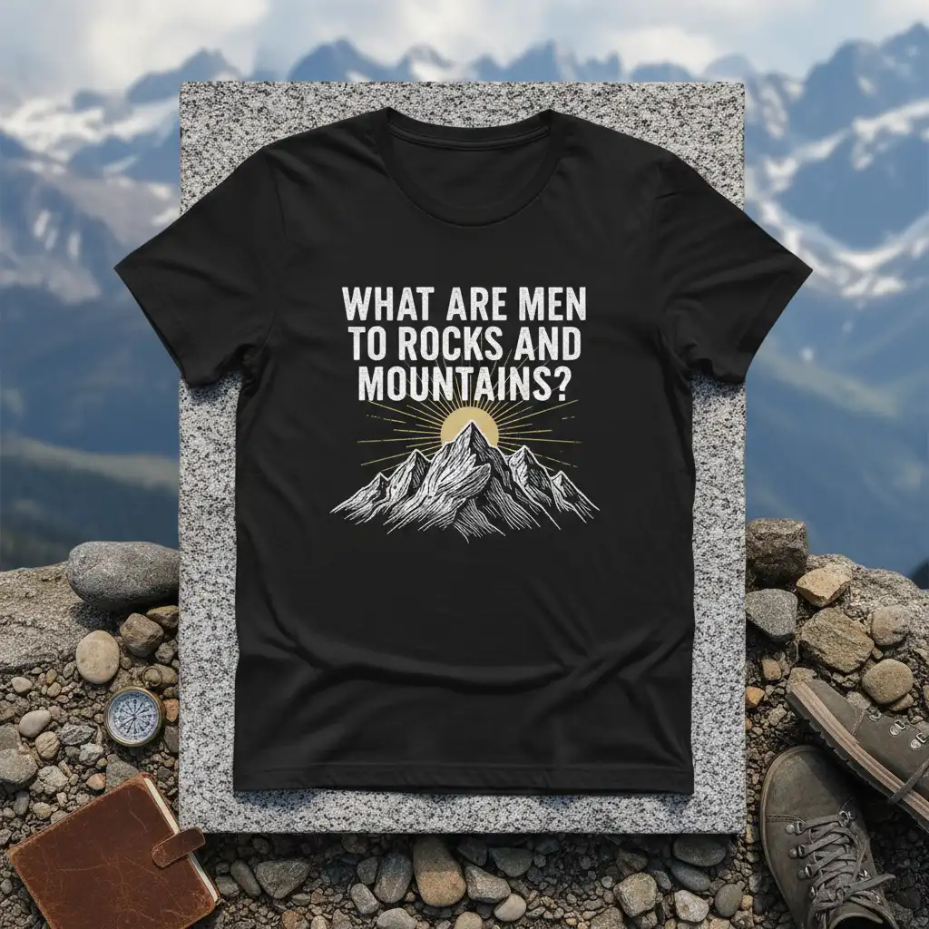 This “What Are Men To Rocks And Mountains?” t-shirt is more than just clothing; it’s a symbol of a lifestyle. It represents the pursuit of adventure, the appreciation of natural beauty, and the search for meaning in the wild. Don’t miss out on the chance to own this unique piece of apparel that speaks to the soul of every true adventurer. Add this inspiring tee to your collection today and wear your passion for the outdoors with pride!