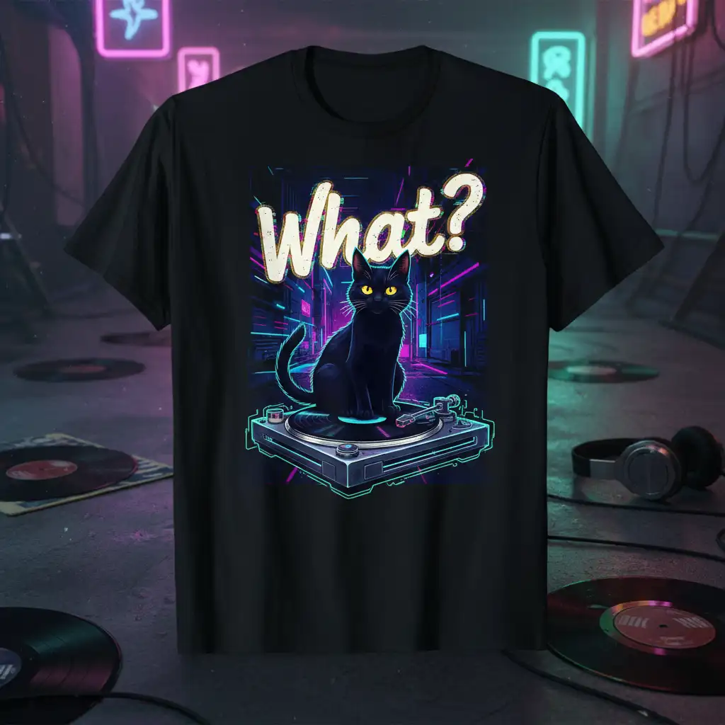 What? This graphic tee is designed to make a statement, blending humor, music culture, and feline charm into one eye-catching design. Perfect for anyone who appreciates a good laugh and a touch of retro flair, this shirt is sure to turn heads. It captures a moment of playful confusion with a stylish, synthwave-inspired aesthetic that appeals to a wide audience. Whether you’re a cat enthusiast, a music lover, or just appreciate unique apparel, this design offers a fresh take on casual fashion.