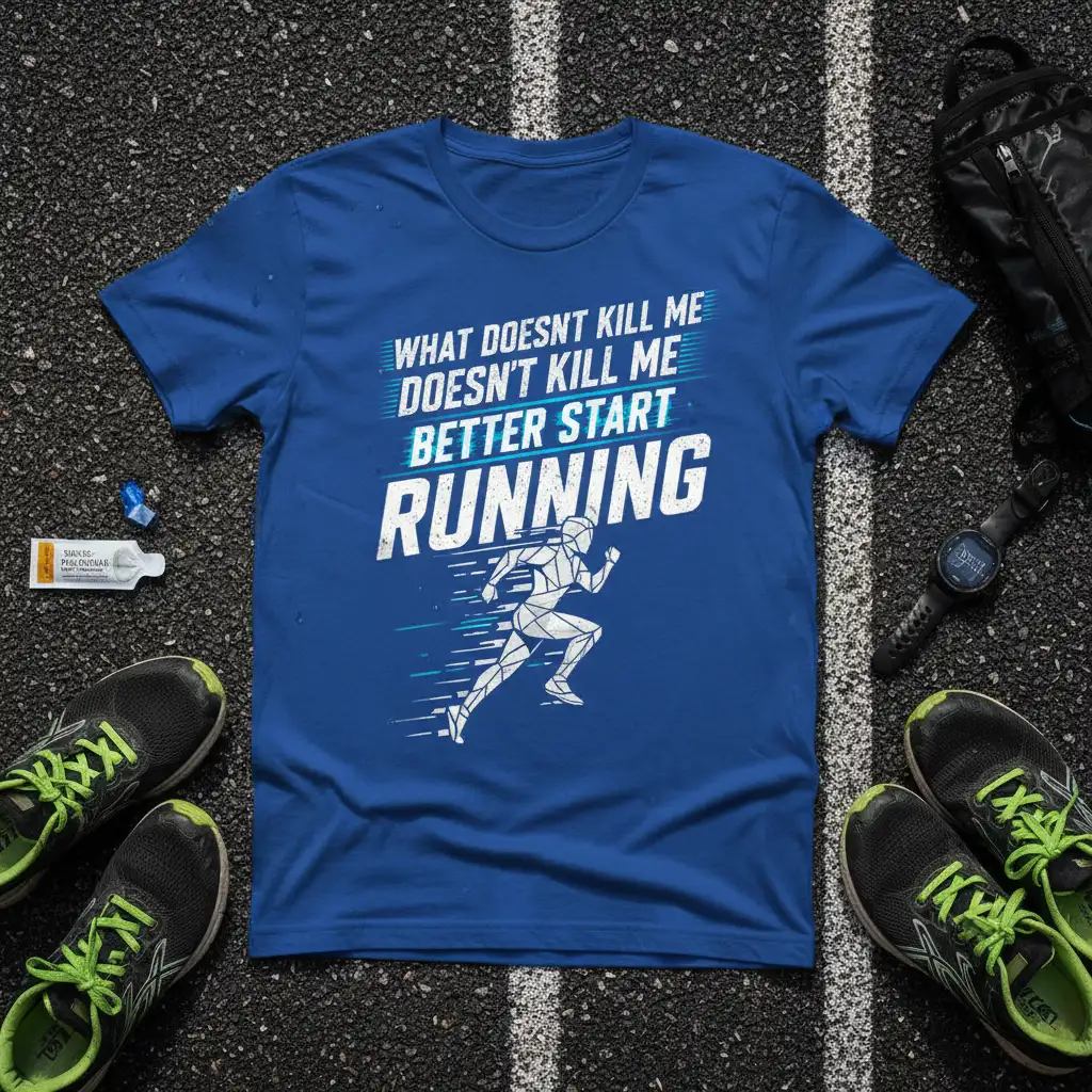 WHAT DOESN’T KILL ME DOESN’T KILL ME BETTER START RUNNING, this powerful mantra is emblazoned on a vibrant blue tee, designed for those who push their limits and embrace the challenge. This t-shirt is more than just apparel; it’s a statement of resilience and determination for every runner, from the casual jogger to the seasoned marathoner. It serves as a constant reminder that every step forward, no matter how tough, builds strength and character. The design is crafted to inspire and motivate, making it an essential piece for your active lifestyle.
