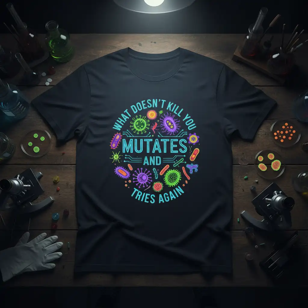 What Doesn’t Kill You Mutates and Tries Again, this phrase perfectly encapsulates the enduring spirit of life and the relentless nature of scientific discovery. This t-shirt is more than just apparel; it’s a statement piece for the curious mind, celebrating the intricate world of biology and the fascinating concept of mutation. Designed for those who appreciate a good science pun, it brings together a humorous outlook with a deep respect for the natural processes that shape our world. It’s an ideal gift for students, researchers, or anyone who finds joy in the complexities of life sciences.