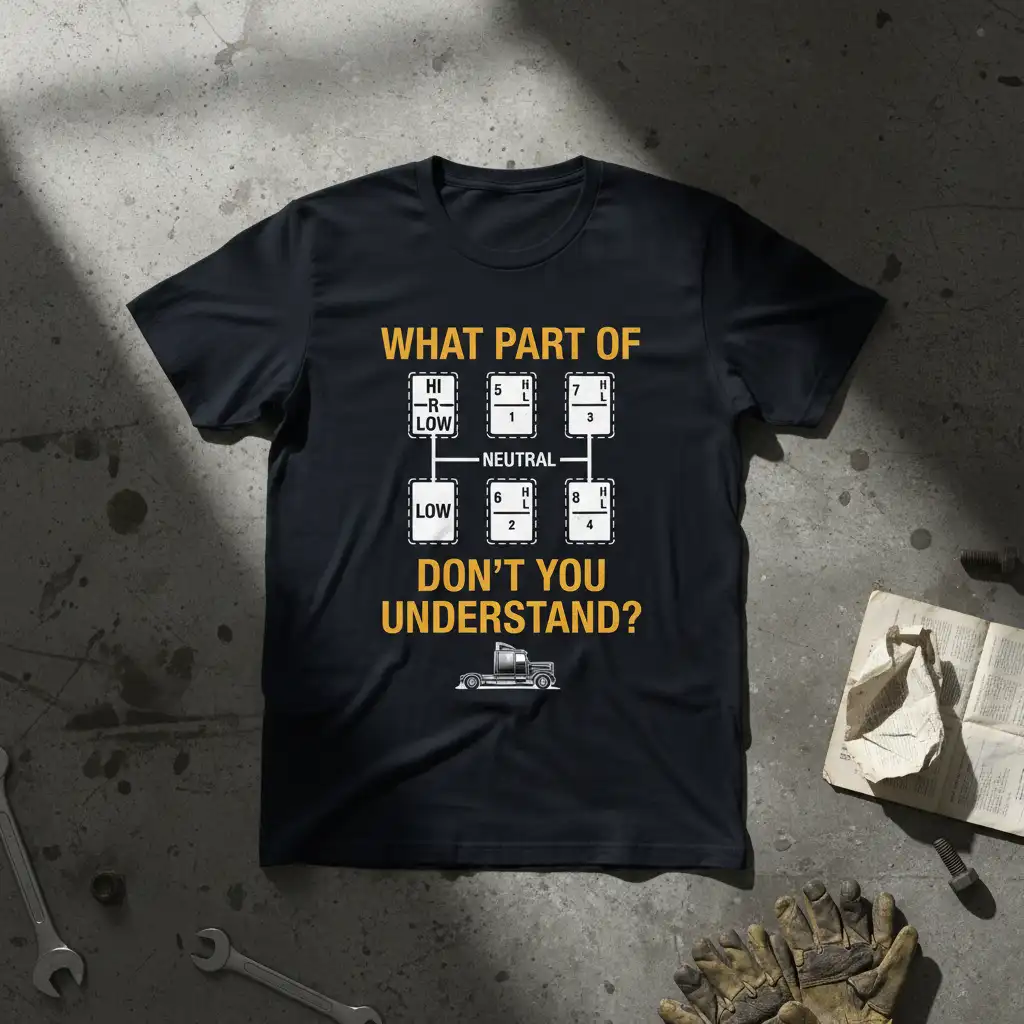 This shirt captures the essence of trucking culture with its bold statement and detailed graphic. The phrase “WHAT PART OF DON’T YOU UNDERSTAND?” is emblazoned across the chest, directly above a clear illustration of a standard 10-speed gear shift pattern. It’s a witty nod to the knowledge truck drivers possess and often have to explain to others. This design is perfect for anyone who spends their days on the road, hauling loads and mastering the art of shifting gears.