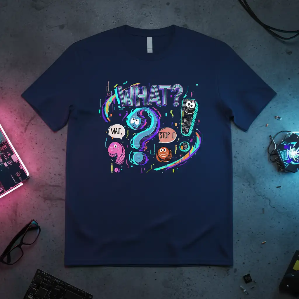This unique graphic tee is designed to resonate with individuals who possess a keen sense of humor and an inquisitive spirit. The vibrant “WHAT?” text is complemented by charming, cartoonish characters caught in moments of contemplation and mild exasperation, complete with speech bubbles exclaiming “WAIT,” and “STOP IT.” It’s a visual representation of those moments when your brain is processing something unexpected or delightfully strange.