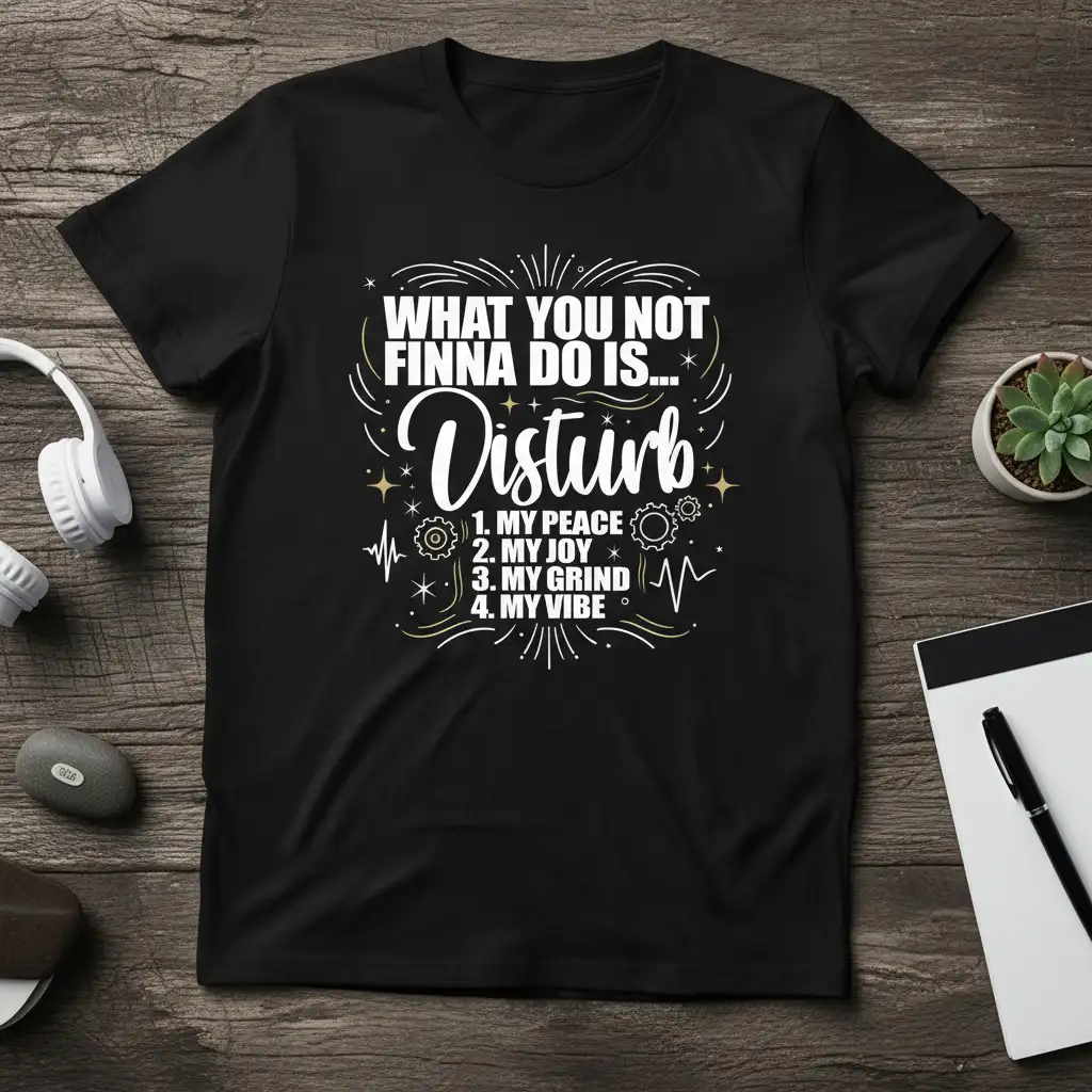 This empowering t-shirt features a compelling message that resonates with anyone who prioritizes their mental and emotional health. The phrase “What You Not Finna Do Is Disturb…” is prominently displayed, followed by a clear list: “1. MY PEACE 2. MY JOY 3. MY GRIND 4. MY VIBE.” It’s a perfect way to communicate your personal philosophy without saying a word, encouraging a mindful approach to life and interactions.