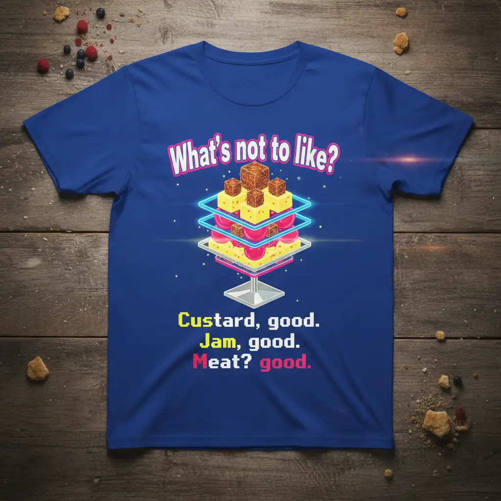 Embrace your unconventional culinary preferences with the “What’s not to like? Custard, good. Jam, good. Meat? good.” T-Shirt. This comfortable tee is perfect for anyone who appreciates a unique blend of flavors. Made with soft, durable fabric, it makes a fantastic gift for the adventurous foodie in your life.