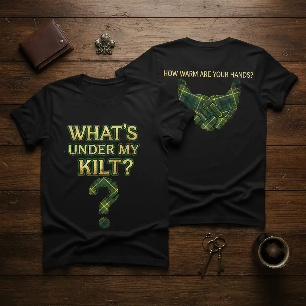 This t-shirt features the attention-grabbing question “WHAT’S UNDER MY KILT?” in striking gold lettering, complemented by a vibrant green tartan question mark. The back playfully asks, “HOW WARM ARE YOUR HANDS?” accompanied by a graphic of two hands shaking, also in a green tartan pattern. It’s a clever nod to Scottish culture and tradition, infused with modern humor.