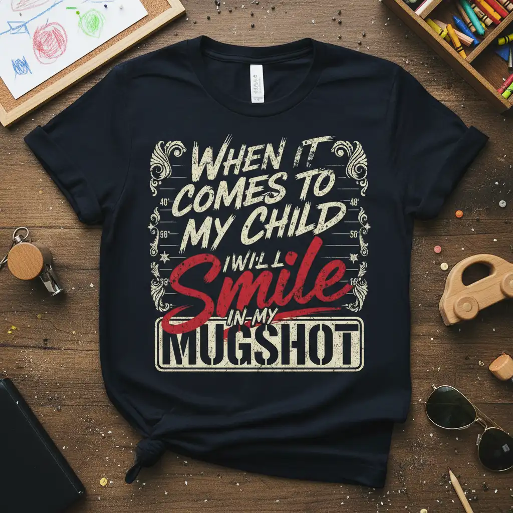 Celebrate the chaotic joy of parenthood with the “When It Comes To My Child I Will Smile In-My Mugshot” T-Shirt. This comfortable tee is perfect for moms and dads who understand that life with kids is an adventure. Made with quality fabric, it’s a fun and relatable addition to any parent’s wardrobe.