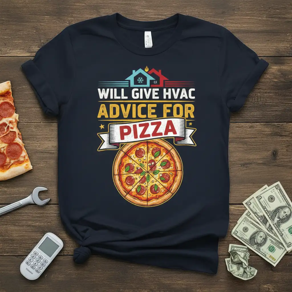 This WILL GIVE HVAC ADVICE FOR PIZZA design features clear, impactful text that immediately conveys the message, paired with a vibrant illustration of a classic pepperoni pizza. This visual element adds a fun and appetizing touch, making the shirt appealing to a wide audience. It’s a fantastic way for HVAC professionals to show off their personality and connect with others who share similar interests.