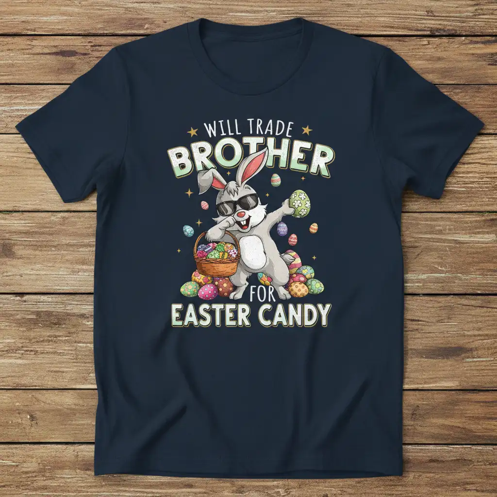 Will Trade Brother For Easter Candy – this phrase perfectly captures the humorous spirit of sibling negotiations during the most wonderful time of the year for sweet treats. This t-shirt is designed for those who understand the universal truth that sometimes, a brother’s affections can be swayed by the promise of delicious Easter confections. It’s a playful nod to the fun and friendly rivalries that make holidays memorable. The design features a cool, dabbing bunny, a symbol of Easter fun, surrounded by a bounty of colorful eggs and hints of sugary delights, making it a standout piece for any Easter celebration.