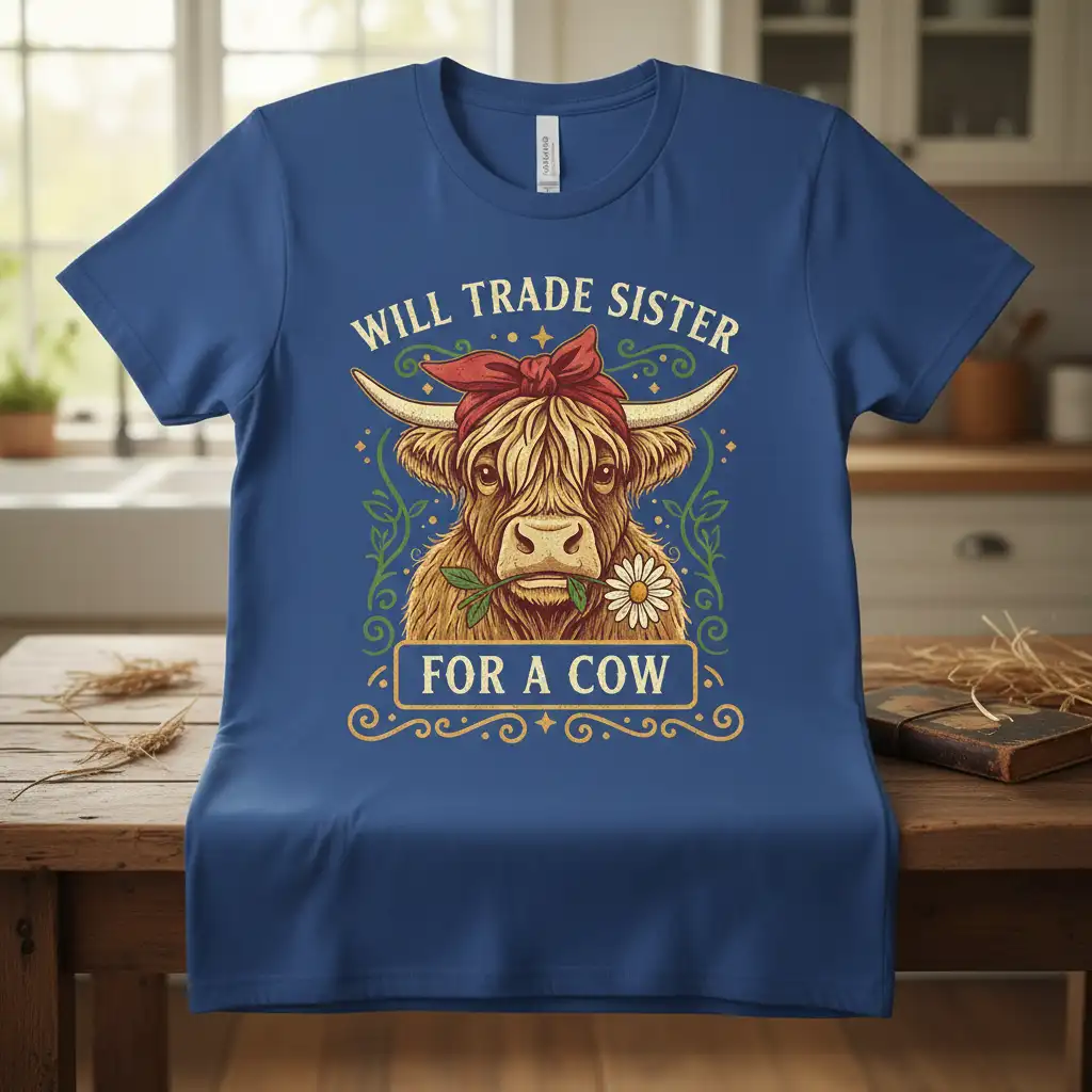 Will Trade Sister For A Cow T-Shirt is more than just apparel; it’s a statement piece for those who hold a special place in their hearts for these gentle giants. This design beautifully merges a humorous sentiment with an adorable graphic, making it a standout addition to any wardrobe. It’s perfect for expressing your unique personality and your undeniable love for all things bovine, especially the iconic highland cow. This tee is crafted to be a conversation starter, bringing smiles and connection wherever you go.