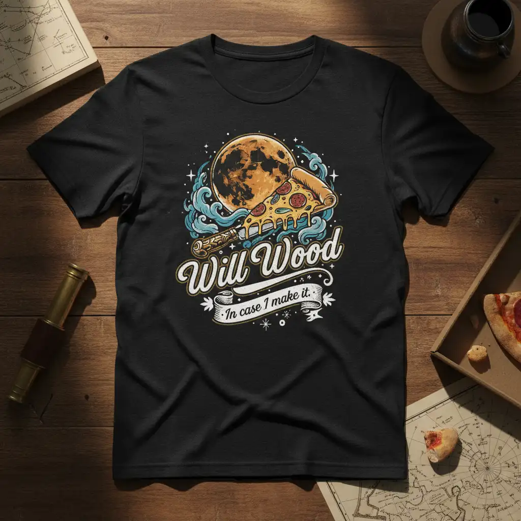 This exclusive Will Wood t-shirt is designed to resonate with the heart of his fanbase. Featuring the full quote “this design,” it offers an exact match for searches by those who know and love his work. The design itself is a visual narrative, combining a whimsical pizza slice soaring through space with a prominent moon and swirling celestial clouds.