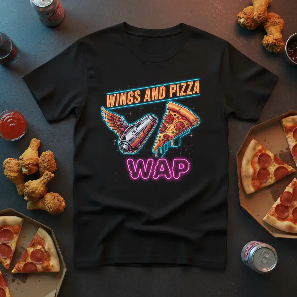 Celebrate your ultimate cravings with the WINGS AND PIZZA WAP T-Shirt. This unique tee perfectly blends iconic food imagery with a popular phrase, making it a must-have for any foodie or music enthusiast. Crafted for comfort and style, it’s the ideal way to express your love for pizza and wings.