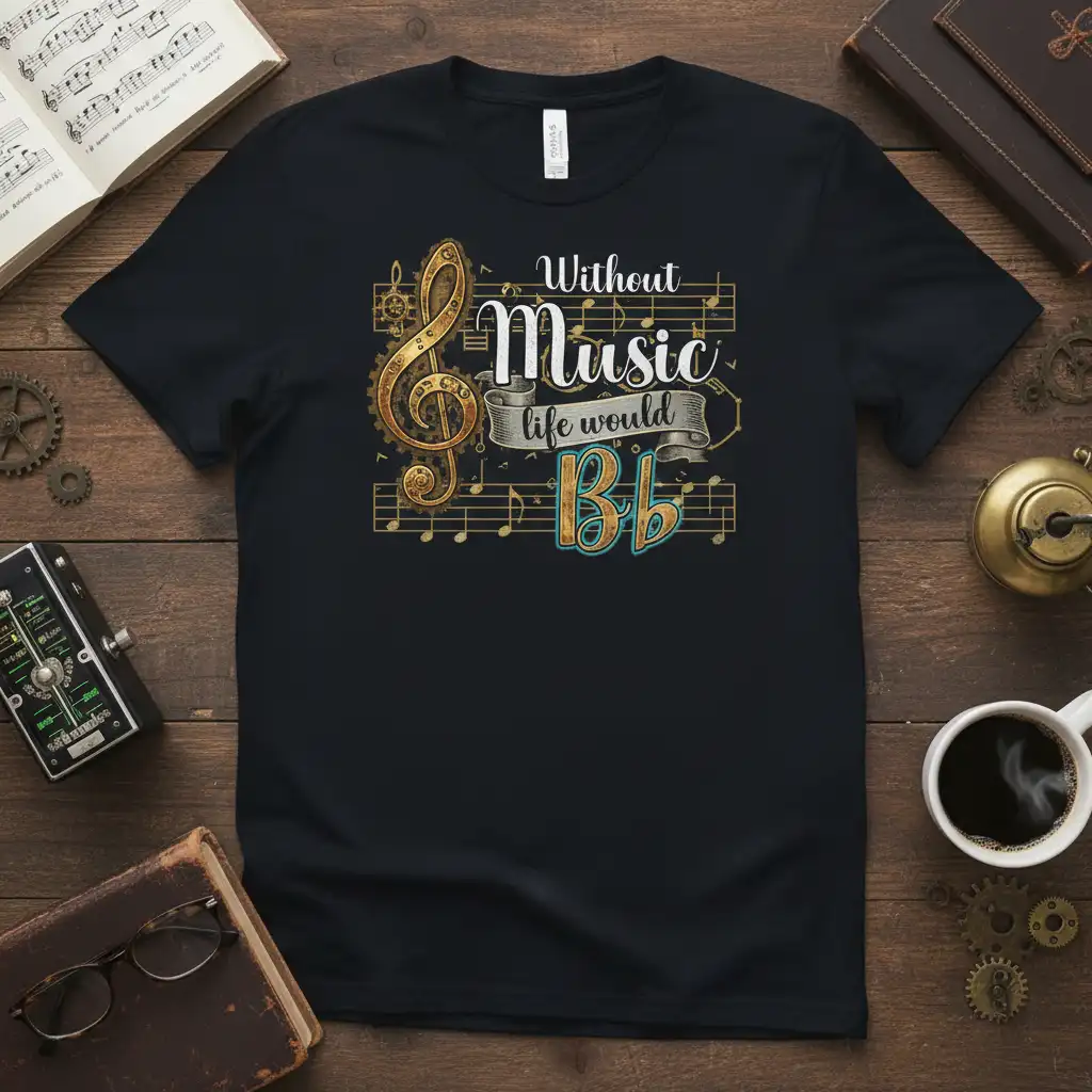 This unique t-shirt celebrates the indispensable role music plays in our lives. The visual elements are carefully curated to appeal to a discerning audience, blending classic musical symbols with a touch of steampunk-inspired artistry. The “Bb” symbol adds a clever musical pun, making the design both intelligent and engaging. It’s perfect for wearing to concerts, rehearsals, music classes, or simply as a daily expression of your musical identity.
