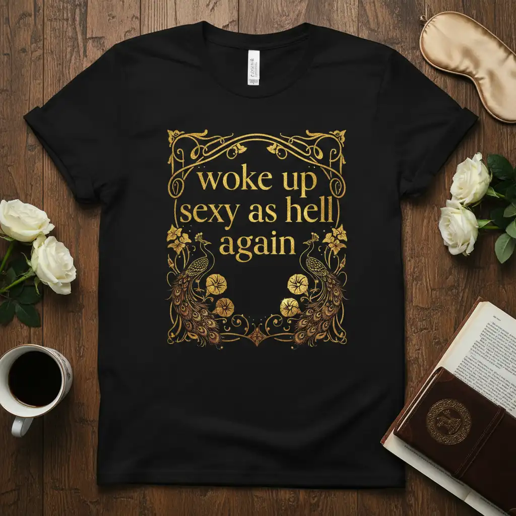 This design is crafted for the modern individual who isn’t afraid to embrace their sensuality and sass. The “woke up sexy as hell again” quote is a playful yet potent affirmation, perfect for those who possess an unshakeable sense of self-worth. The luxurious gold accents and the majestic peacock motif add an element of sophistication, making this tee suitable for various occasions beyond casual wear.