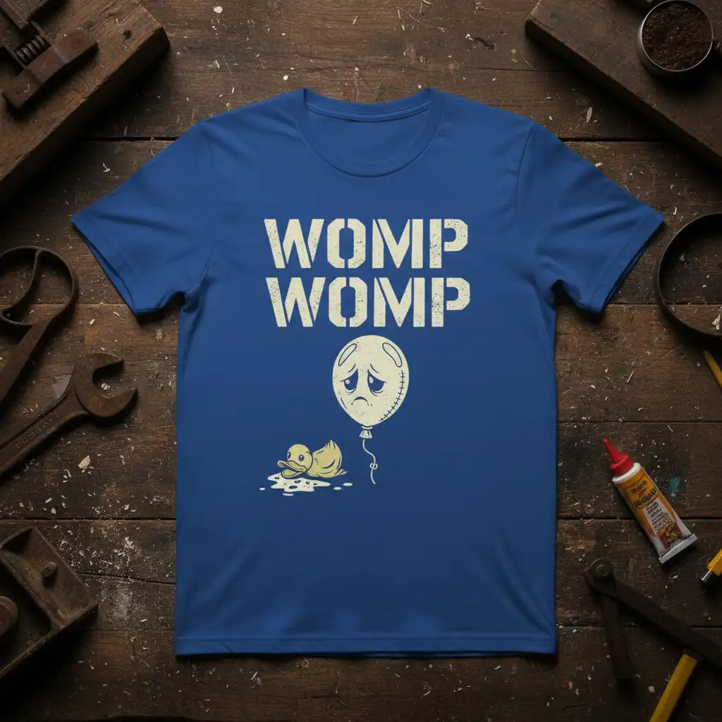 WOMP WOMP is more than just a phrase; it’s an entire mood, a reaction to life’s less-than-ideal moments, and now, it’s a statement piece for your wardrobe. This t-shirt captures that perfectly with its iconic distressed lettering and a hilariously sad cartoon. It features a melancholic duckling next to a teary-eyed, deflated balloon, embodying that feeling when things just don’t go as planned. It’s the ideal garment for anyone who understands the universal language of the “womp womp” sound effect and appreciates a good dose of relatable humor. Wear it to express your inner feelings without saying a word.
