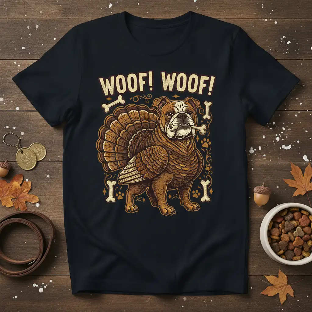 The “WOOF! WOOF!” graphic is not just text; it’s an exclamation of holiday joy, perfectly complementing the visual of the bulldog-turned-turkey. This design is a testament to creative expression, blending the loyal nature of a bulldog with the iconic imagery of Thanksgiving. The playful arrangement of bones around the central figure adds a whimsical touch, enhancing the overall festive and fun aesthetic of the t-shirt. It’s a unique take on holiday apparel that stands out from traditional designs.