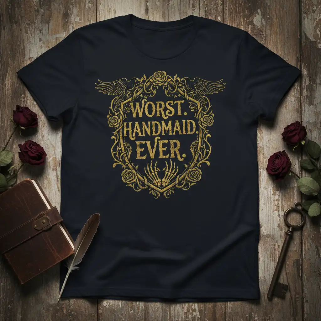 The “Worst Handmaid Ever” graphic tee is ideal for anyone who wants to stand out from the crowd with a touch of playful rebellion. The detailed artwork, featuring gothic elements and skeletal imagery, adds a layer of intrigue to the bold statement. It’s a perfect choice for those who are not afraid to be a little unconventional and love to share a laugh. This shirt embodies a spirit of fun and individuality, making it a standout piece in any casual wardrobe.