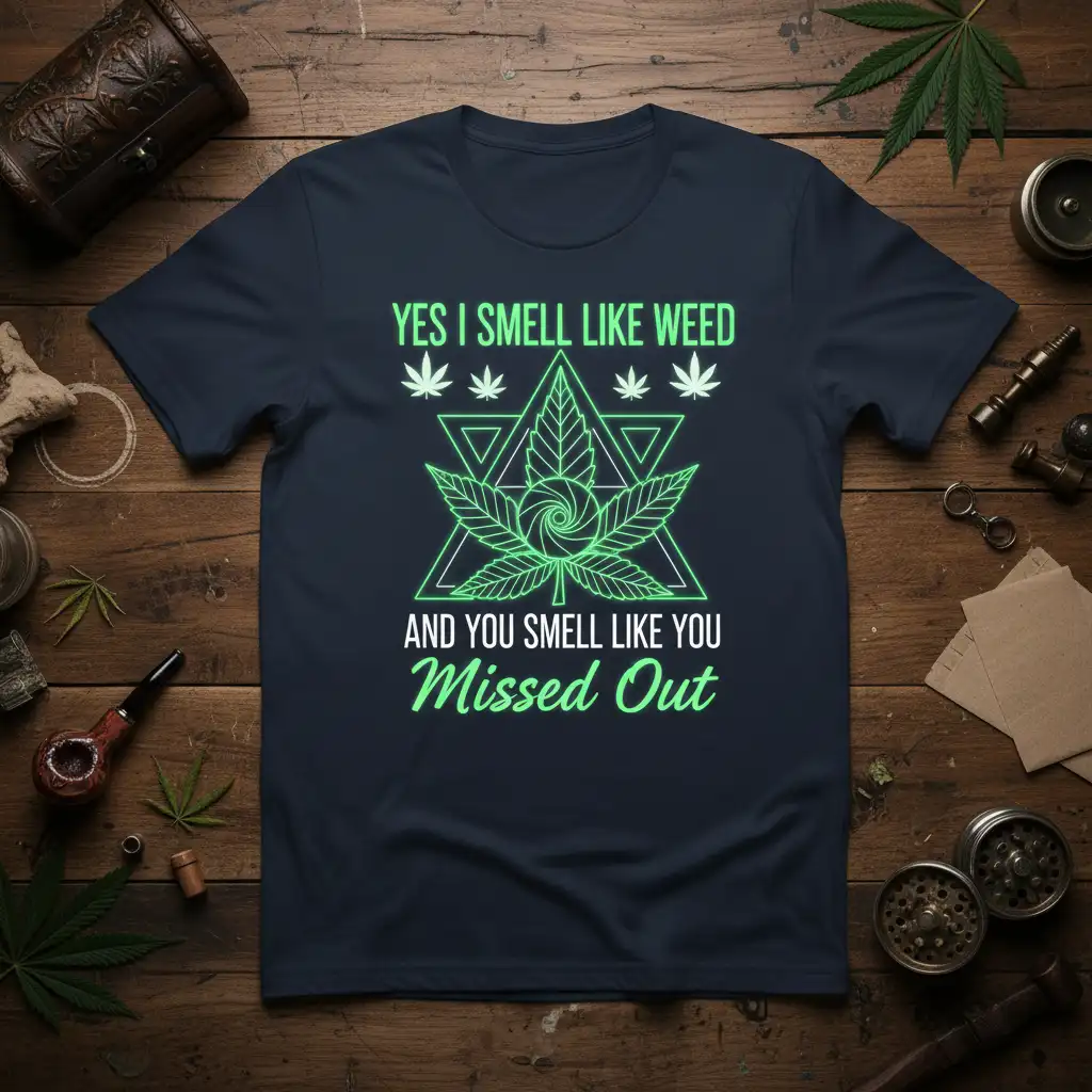 This eye-catching t-shirt features a vibrant neon green design that pops against the deep navy fabric. The prominent quote, “YES I SMELL LIKE WEED,” is complemented by a striking cannabis leaf emblem, symbolizing a connection to the plant and its culture. Below this, the playful retort, “AND YOU SMELL LIKE YOU Missed Out,” adds a witty punchline.