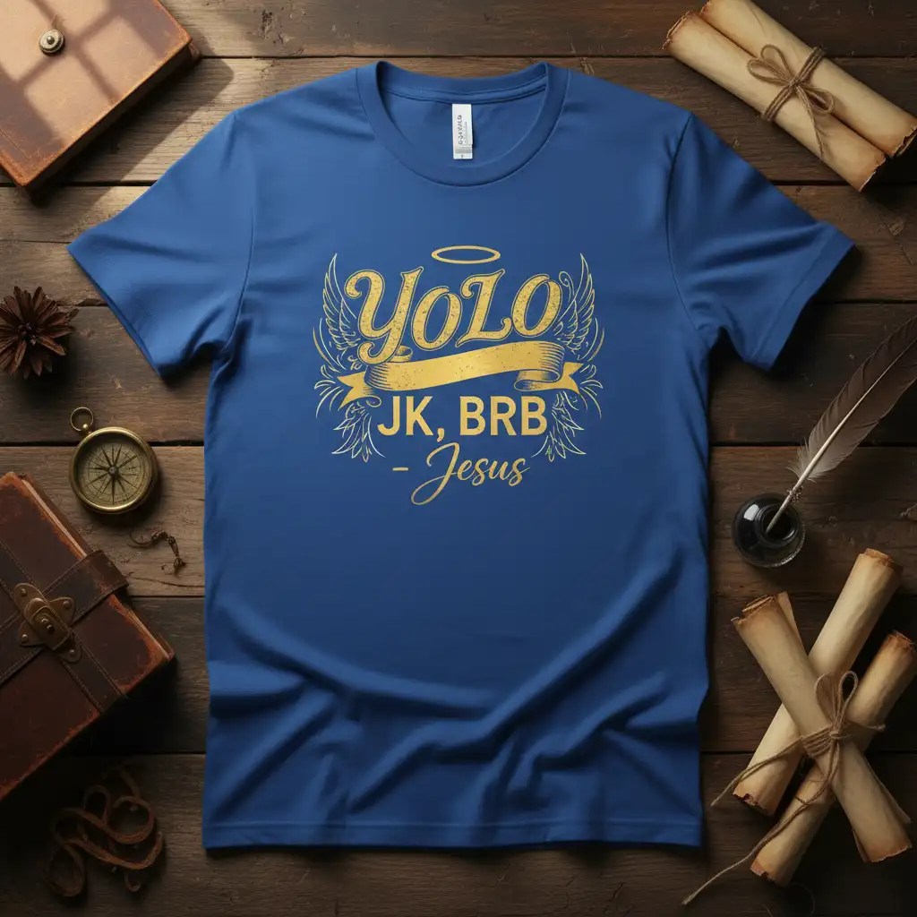 The YOLO JK, BRB – Jesus T-Shirt: Faith with a Wink