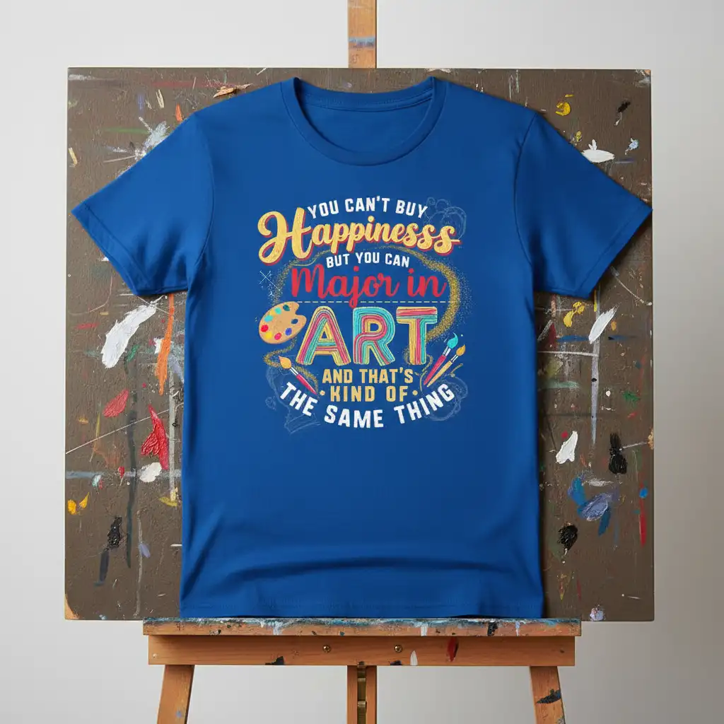 You Can’t Buy Happiness But You Can Major in Art And That’s Kind Of The Same Thing. This sentiment beautifully encapsulates the passion and fulfillment found in pursuing artistic endeavors. For those who live and breathe creativity, art isn’t just a subject; it’s a way of life, a source of joy, and a profound expression of self. This t-shirt is designed to resonate with every artist, art student, and art enthusiast who understands that the journey of creation is its own reward. It’s a wearable declaration of love for the arts and the happiness it brings.