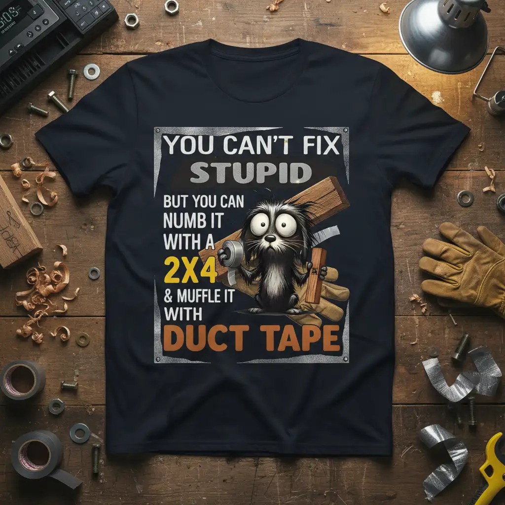 This “You Can’t Fix Stupid But You Can Numb It With A 2×4 & Muffle It With Duct Tape” t-shirt is the ultimate expression of humorous defiance. It’s a declaration of your personality, your sense of humor, and your appreciation for the absurdities of life. Don’t just wear a t-shirt; wear a statement that sparks joy and laughter. Grab yours today and let the world know you appreciate the power of a good 2×4 and plenty of duct tape!