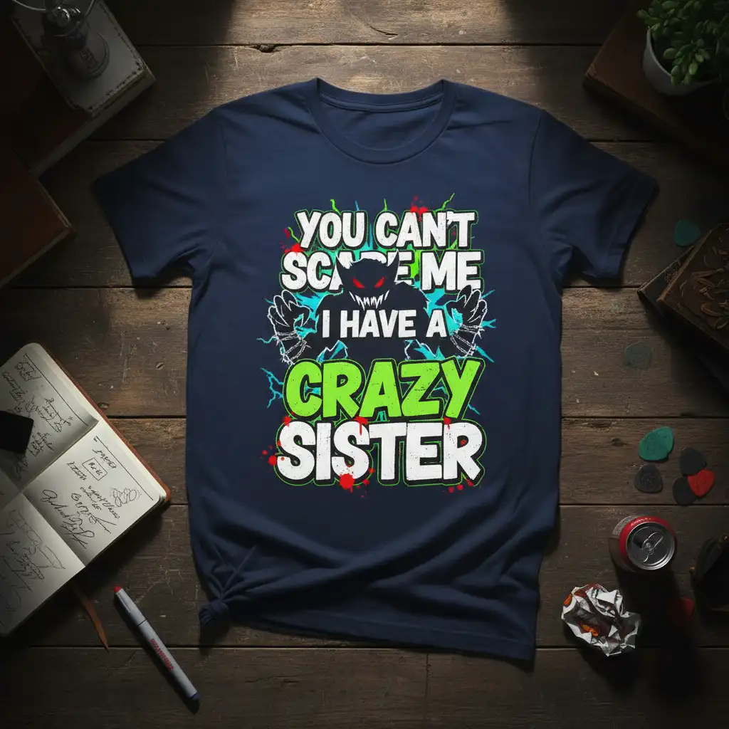 This t-shirt is designed for anyone who has a sister that brings a bit of wild energy and unpredictable fun into their life. The phrase “YOU CAN’T SCAREM E I HAVE A CRAZY SISTER” is emblazoned across the chest in vibrant, attention-grabbing colors, complemented by a monstrous graphic that adds a touch of playful menace. It’s a conversation starter and a badge of honor for those who understand the unique dynamics of sibling relationships. This design is perfect for Halloween, birthdays, or any occasion where you want to celebrate your sister in a memorable way.