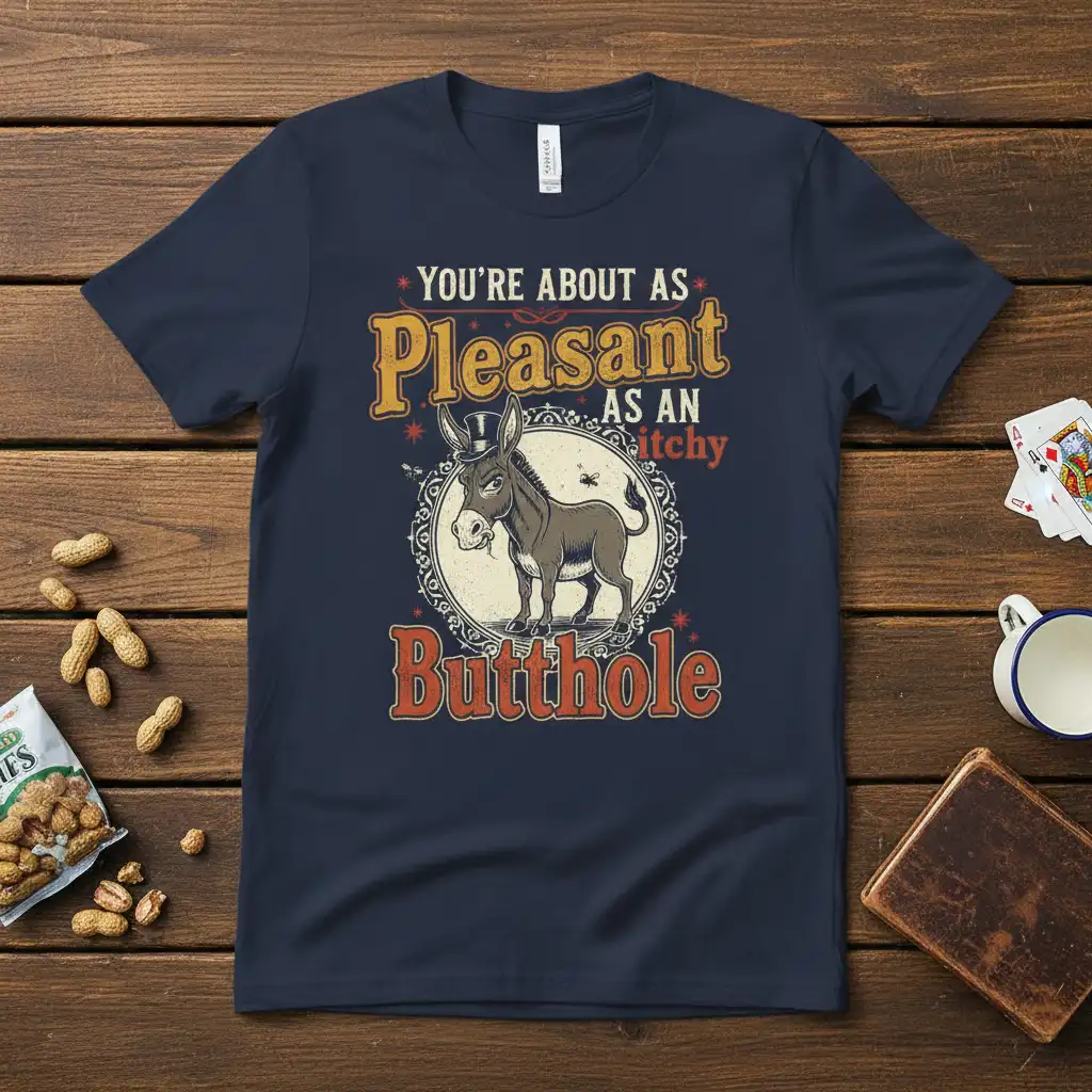 You’re About As Pleasant As An Itchy Butthole this t-shirt is a bold declaration for those who don’t shy away from expressing their true feelings, especially with a touch of humor. It’s designed for individuals with a sharp wit and an appreciation for the unconventional, perfect for anyone who enjoys making a statement. This garment is more than just apparel; it’s a wearable attitude that speaks volumes without saying a word. Get ready to turn heads and spark conversations wherever you go with this unique and unforgettable design.