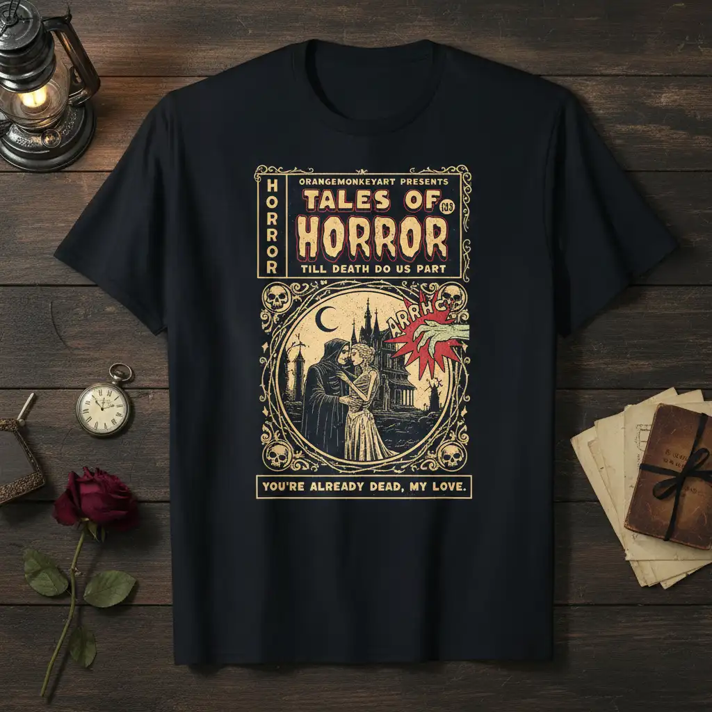 Looking for the perfect YOU’RE ALREADY DEAD, MY LOVE.? You’re Already Dead, My Love, this t-shirt captures the essence of dark romance and vintage horror in a truly captivating design. For those who find beauty in the macabre and love a touch of gothic flair, this shirt is an absolute must-have. It tells a story of eternal devotion, even beyond the veil of death, presented in a style reminiscent of classic horror comic book covers. This unique piece is designed to stand out and express a distinctive personality. Embrace the allure of the eerie and the romantic with this unforgettable graphic tee.